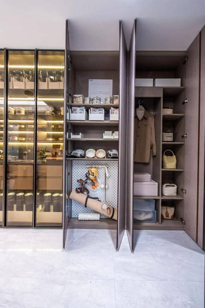 玄关收纳:交付约2.8米长的超尺度玄关柜,提供了强大的入户收纳能力,内部规划了石材置物台、悬空拖鞋区、柜内更衣镜等,细节考虑周到