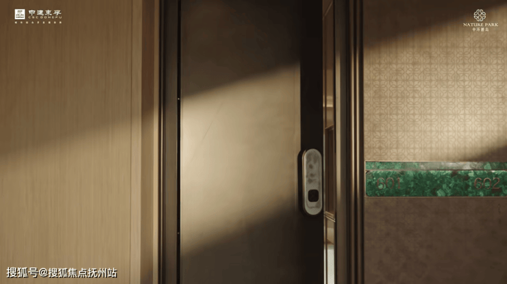 从入户门开始,香槟金哑光色调的铸铝门,镶嵌着白色玉石的门把手,第一眼就能感受到归家的高级质感.