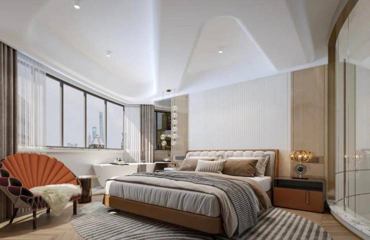 奢阔宽厅,大面积玻璃寰幕墙映衬繁华街景,客厅挑空设计,更具空间感的大气朗阔感受,吧台连接陈列展示区,增添优雅的层峯底色,独立卧室层,三间套房奢华配置,尊享静谧.