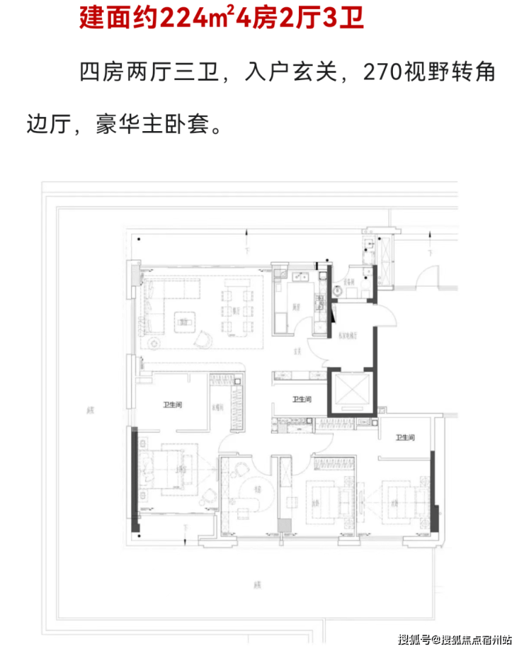 建面约216-254㎡四房(共74套):四叶草布局(四房互不干扰),动静分区,豪华主卧套房(含衣帽间、双台盆浴室、观景飘窗),270°转角边厅(落地玻璃窗),尽揽外滩天际线与园林水景。