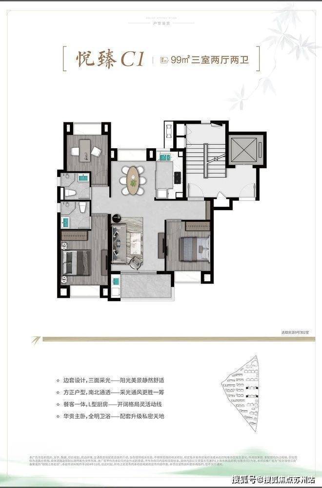 99平户型是主流飞机户型,三开间朝南,洋房得房率相当高,客厅窗外可以看到楼栋距很宽,中央空调、地暖也配齐了。