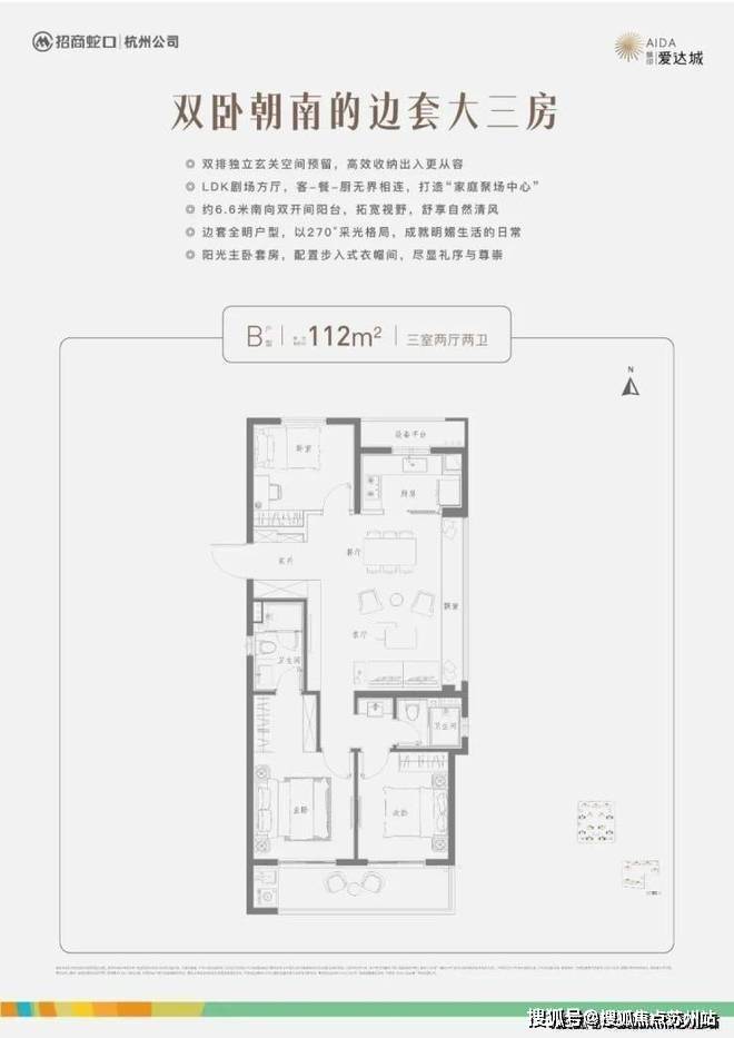 杭州缤印爱达城售楼处电话☎:400-8828-814(售楼处预约看房热线)建筑面积约112㎡的三房户型,则是将“精致的实用主义”贯彻到底。玄关的打造,不仅增添了归家的仪式感,室外与室内的天然过渡,也让居家更整洁。客餐厅的一体大飘窗无疑是最吸睛的存在,打造成多功能休闲区,品茶、读书、下棋,悠闲自在。主卧衣帽间、卫浴间、景观阳台一应俱全,私密而优雅,将生活的幸福感拉满。南次卧紧邻次卫,有着“套房”的既视感,两卫的设计,针对成员比较多的家庭,避免了早高峰使用期的尴尬。