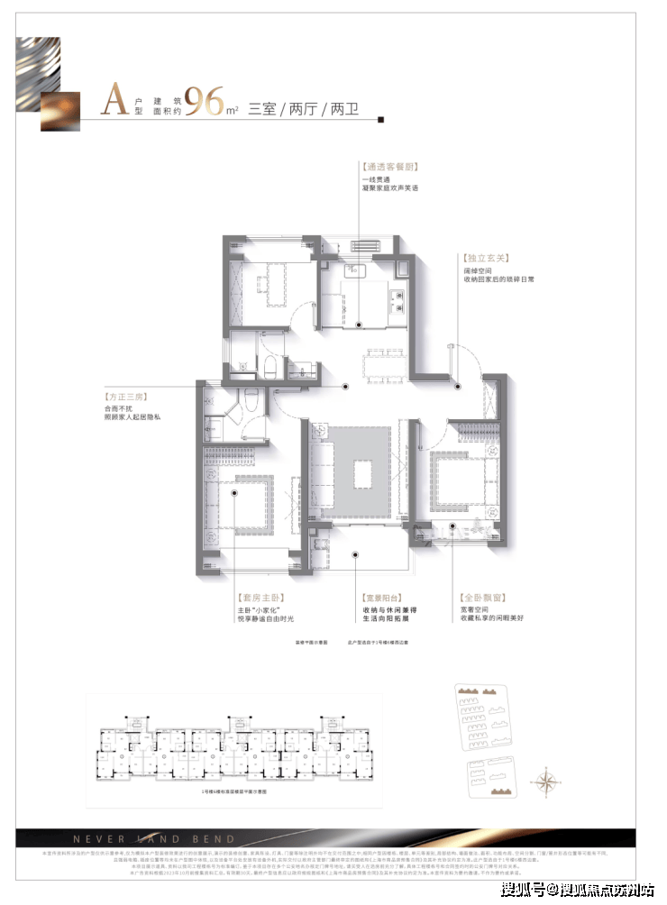 招商云澜湾售楼处电话:400-902-3966建面约100㎡的三房两厅两卫户型,可以说是约96㎡3房的升级版,空间更加延展,整体横厅面宽约5.2米(轴中距),形成更大的南向采光面,且搭配南向观景阳台,直接做到了3.5面宽朝南,这在同类产品中是比较少见的。