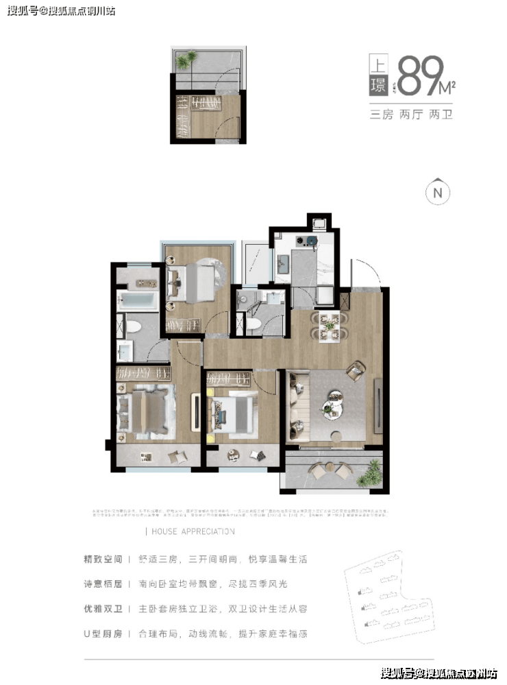 经典的小三房,胜在两卫设计,功能性很齐全。