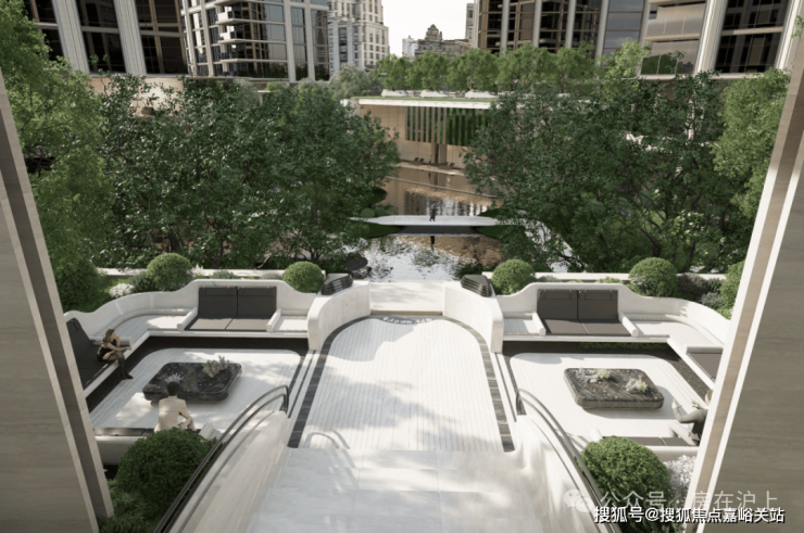 穿过园林,上海最大的约3500㎡下沉水院构成社区的核心灵魂,约13米的高差形成独特的“峡谷绿洲”,将黄浦江的水意象引入社区,中央平静水面与四周的会客舱、茶室、游泳馆形成呼应。