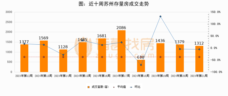 存量房方面,第21周苏州存量房成交1312套,较上周减少67套,环比下降4.9%。从近十周成交走势来看,周均成交套数为1407套,本周低于平均水平6.8%。