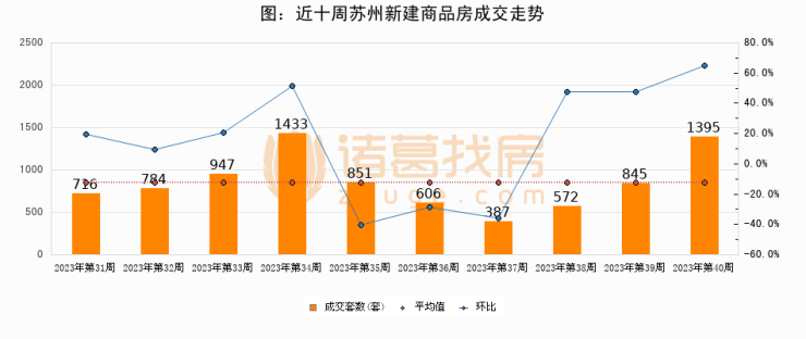 进入2023年第40周(09月25日-10月01日),苏州新建商品房成交1395套,较上周增加550套,环比上涨65.1%