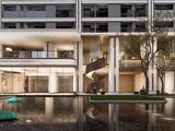 地上入户大堂方面,在造型上运用了中式元素挑檐,搭配香槟金型材金石嵌套设计,显示出一种精致奢华却内敛的感觉。