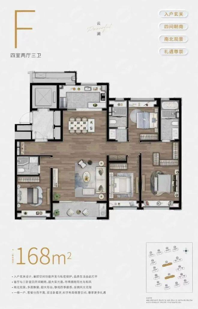另外,四房户型双房朝北似乎是逃不开的问题,但陆家嘴锦绣云澜这个建面约168㎡的4房却做到了三间卧室全朝南,并且南向双套房设计。