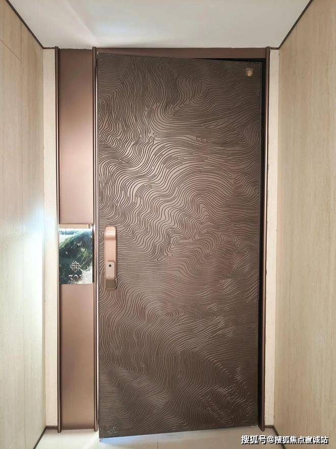 实景电梯厅铺设梵高印象岩板,电梯轿厢选用冷翡翠大理石。