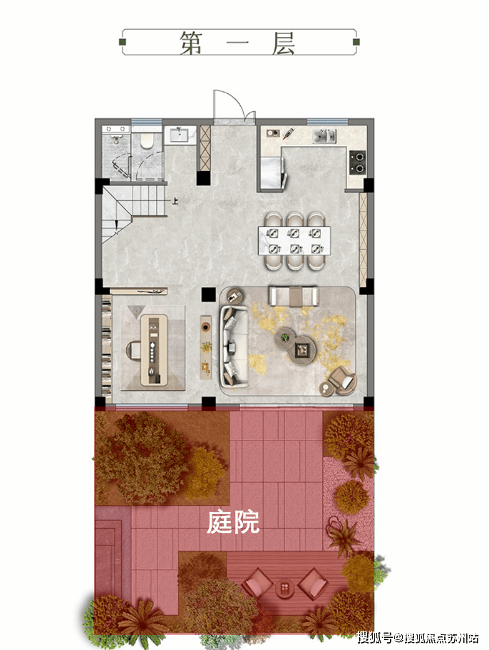 一层,可打造成家庭私享厅,一家人在这里吃饭、互动交流,十分温馨。也可以把南向客厅打造成老人房间,无论是三代同堂还是一家三口、二孩家庭,家人之间互不打扰,相当私密。
