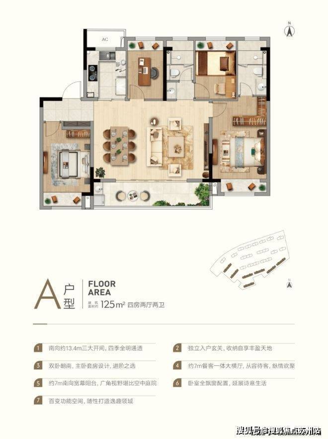 苏州泉山雅境售楼处电话☎:400-8828-814(售楼处预约看房热线)约125/139㎡洋房,是“宽·透·精”的户型,南向分别约13.4/14.6米大面宽,尺度宽绰,舒适朗阔,囊括卧室、餐厅、客厅主要起居空间,全家人都可以向南而居。