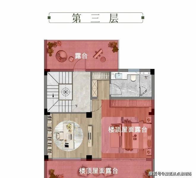 三层,整层套房设计。该层赠送约23㎡的南北双向大露台,这里作为建筑的“空中延伸空间”,兼具视野开阔、采光充足的优势,无论是打造成亲近自然的露台卧室,还是多功能的生活场域,都能极大提升居住体验。
