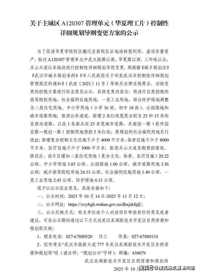 近日,市规划和自然资源局发布《关于主城区A120307管理单元(华夏理工片)控制性详细规划导则变更方案的公示》