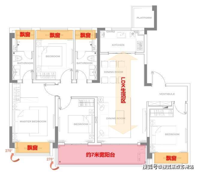 该户型以入户大玄关+大四房+多飘窗+270°转角阳台的设计,4开间朝南面宽13.6,客厅+次卧双阳台设计开间7米,主卧开间3.5米,右次卧开间3.1米。