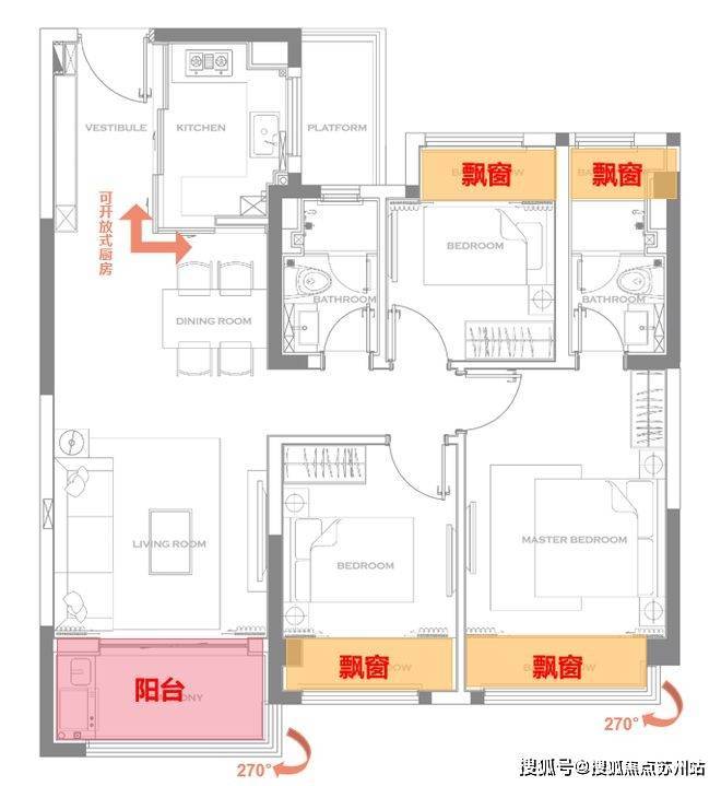 该户型开间9.4米,在售新房中唯一做到了开放式LDK+延伸岛台的设计,三开间朝南,主卧套房设计。