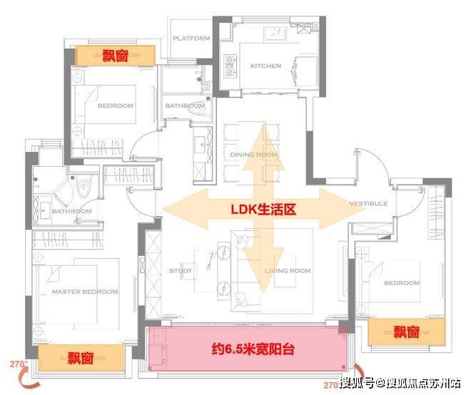 该户型4开间朝南,客厅和书房一体开间6.5米(其中书房部分2.6米),通感LDK设计,主卧开间3.5米,南次卧开间3米,北次卧开间2.8米,厨房开间3.3米,餐厅开间2.9米。