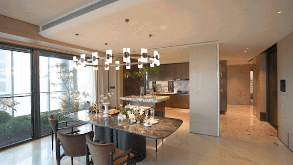 以黄浦江为灵感,营造“阅尽千帆后的宁静与松弛感”。通过8.5米南向宽厅、270°环幕玻璃、无冗余装饰的减法美学,让空间如江面般舒展,视野极度开阔!