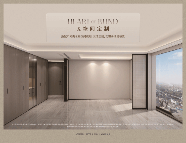 项目的滨江大户型,以无界平层结构,配合3.3米层高(部分)和全景落地窗打造270°环幕江景舱,实现上海滨江市场罕见的IMAX环幕江景视野!