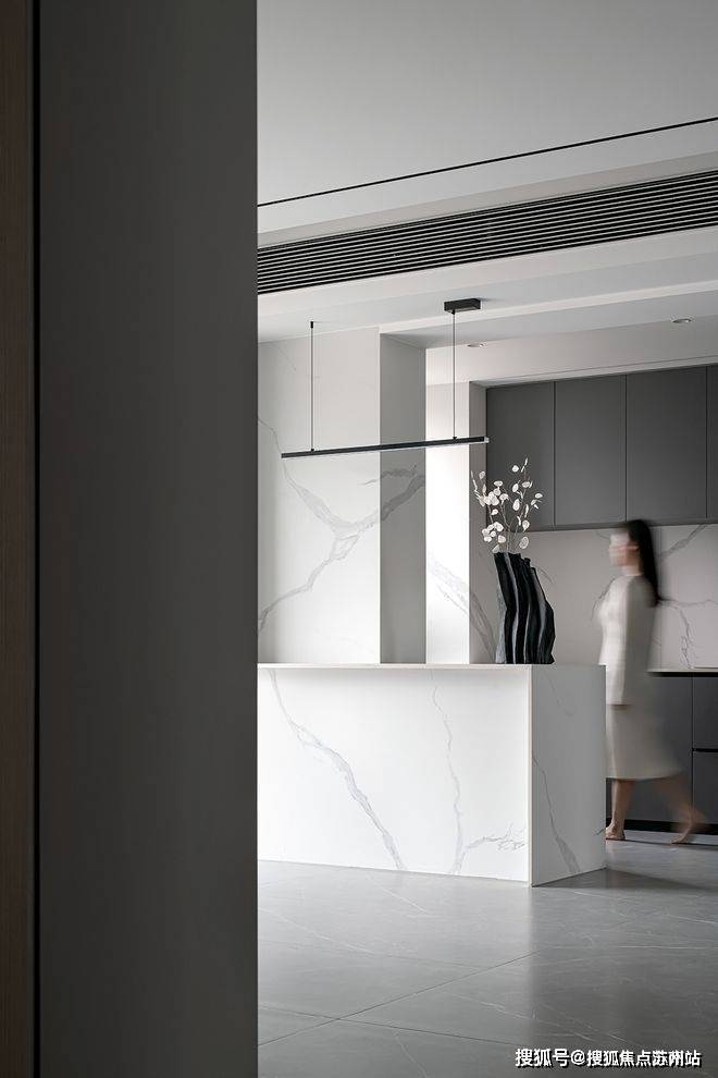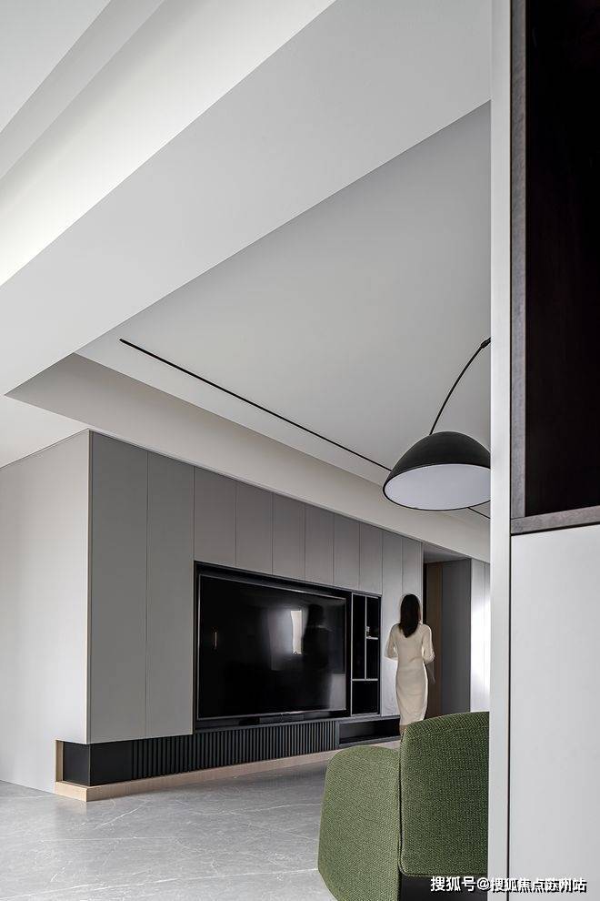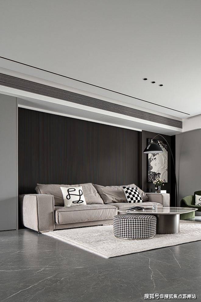 Thedouble-layerceilingdesigncleverlygivesthespacearichersenseofhierarchy.Thebackgroundwallofthelivingroomsofaismadeofgrayhardcovermaterialandembellishedwithmetallines,whichrevealsatmosphereandeleganceinsimplicity.