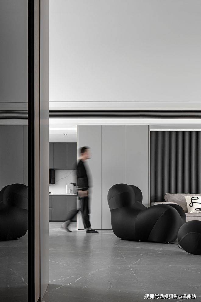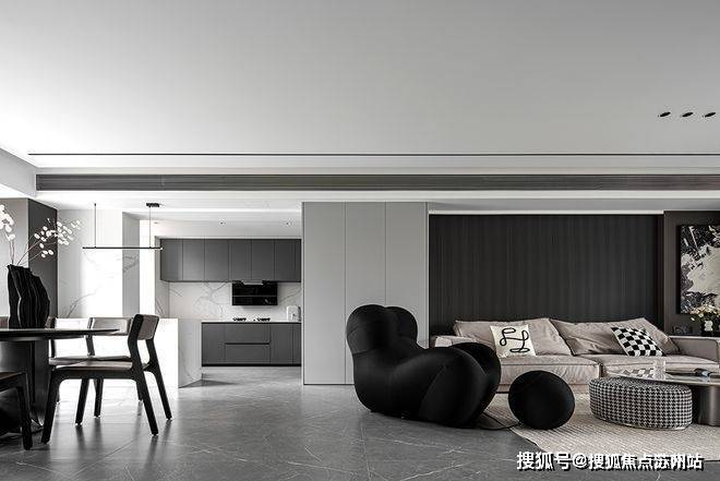 设计中贯穿的开放式布局,抛却了传统封闭的束缚,使各功能区自然而然地相互融合。黑色的异形沙发如一曲动感的旋律,注入了空间活力,其多处凸起的设计,更是贴合身体曲线,为居者带来舒适无比的体验。