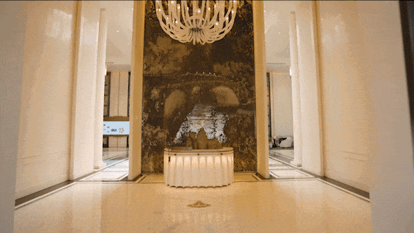 整体的归家落客尺度设计复刻了《周礼·考工记》中记录的建筑最高礼遇“面阔九间”的设计,同时,在归家酒店式落客空间,以山茶花元素为源定制了“海派漩心”艺术装置,将文化之美深入建筑的深处。