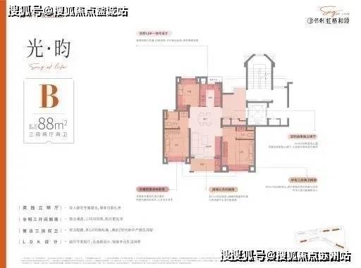 臻奢建面约88㎡/99㎡户型,专属定制类独立梯厅,让生活拥抱私密和尊崇,LDK餐客厨一体化设计,动线流畅,链接多元生活场景,南北通透三开间朝南设计,承载生活更多浪漫。
