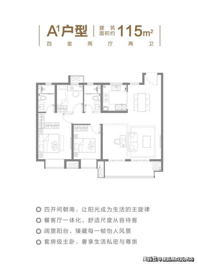 本批次新加推的建面约123㎡的4房2厅2卫户型,则是115户型的进阶版。同样四开间朝南,餐客厅一体化设计,真正的南北通透,尺度感和舒适度更高。