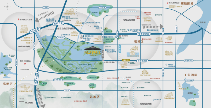 项目就在相城、姑苏、新区三区交汇的黄金位置,出门就是繁华城芯,配套要啥有啥。但最绝的是,它零距离挨着约873公顷的虎丘湿地公园,相当于把整个苏州的“城市绿肺”当成了自家后花园。这种被大自然环抱的奢侈,苏州城里恐怕再也找不出第二块了。