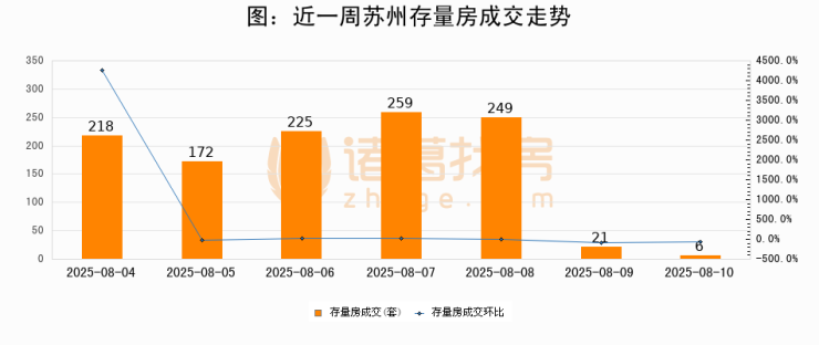 从存量房来看,2025年08月10日苏州存量房单日成交6套,比昨日减少15套,环比下降71.4%。从近一周存量房成交来看,苏州存量房日均成交套数为164套,08月10日单日成交6套,低于近一周平均水平96.3%。