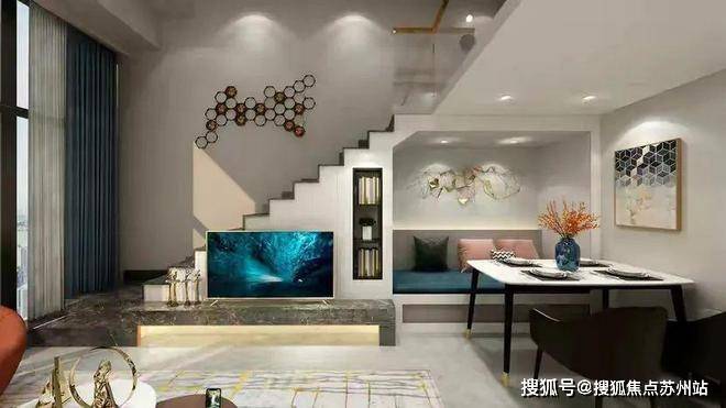 保留了客厅的挑空,将复式盘的优势被发挥得淋漓尽致。并且,一整面落地窗让整个空间更显大气。 沙发旁摆放的新中式风格的小边几搭配着白色长城板,也是将整个客厅增堆满的高级感。 而窗边放置的懒人椅,可以在下班后卸下满身疲惫,放松地欣赏着这灯红酒绿的世界。