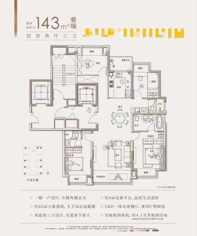 143㎡四房三卫:三分离卫生间设计,主卧套房约25㎡,配备独立衣帽间与双台盆卫浴,U型厨房+3.6米超长料理台,LDK一体化布局,南北通透