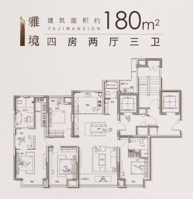 180㎡四房三卫:双套房设计,主卧约40㎡,双台盆卫浴,多重收纳系统,适合三代同堂或高端改善家庭