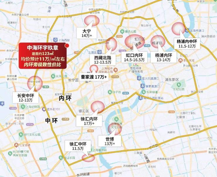 内环内新房普遍12万+/㎡,静安曹家渡约17万+/㎡、虹口14.5-16.5万/㎡;内中环如大宁14万+/㎡、长宁中环旁12-13万/㎡、浦东世博13万+/㎡。