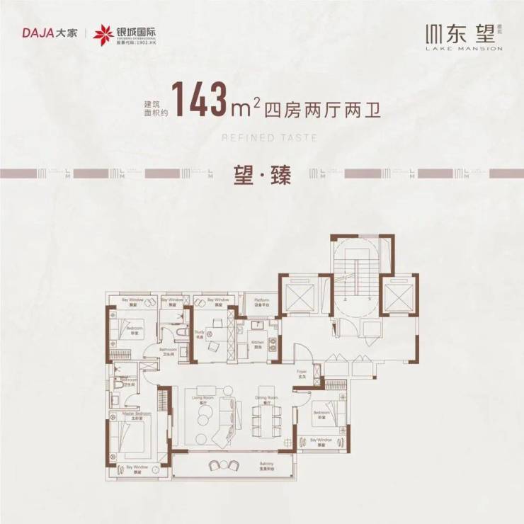 143㎡的户型就更阔绰了,四房设计。可以把南向的卧室给父母,北面的书房改成孩子的游戏学习天地。客厅、餐厅连成一个大通厅,一家人吃饭、看电视、其乐融融,空间绰绰有余。无论是改善型住房需求,还是追求一步到位的品质生活,这里的户型都能满足。
