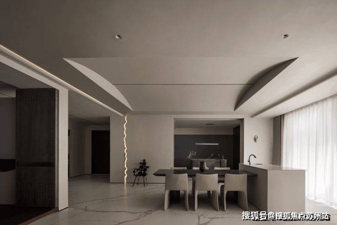 开放式布局,竖向的延展,拉伸了整个空间的尺度,体感上的通透给予生活更广阔的视野,当屋外的日光透过白纱,在纯净的氛围中糅入生活的气息,居者将更能感受饮食时光的美好温度。
