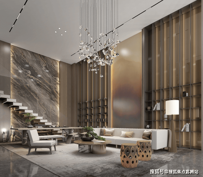 外立面以真石材与香槟金铝板为主基调,纵横穿插香槟金属线条,形成独具特色的鎏金立面,写意板块建筑封面气象。