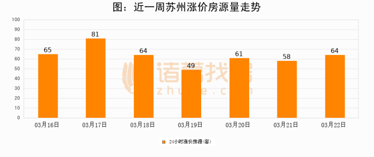 根据诸葛找房数据显示,苏州24小时涨价房源量为64套,较03月21日增加6套,环比上涨10.3%。与此同时,涨价房源占比小幅扩大,业主信心有所提升。