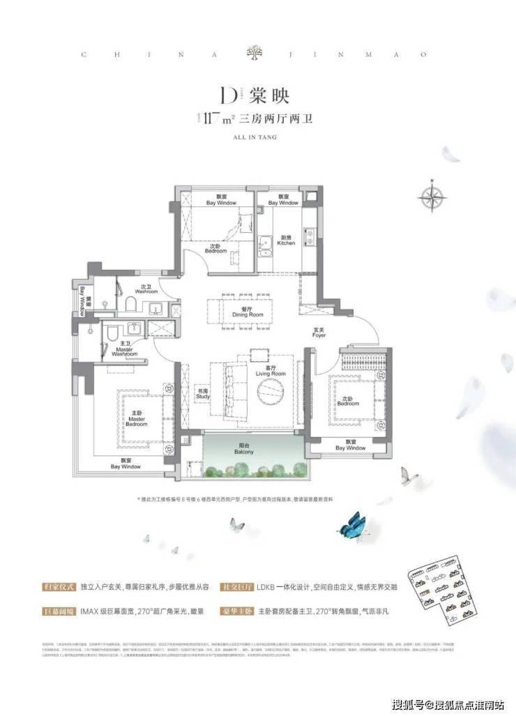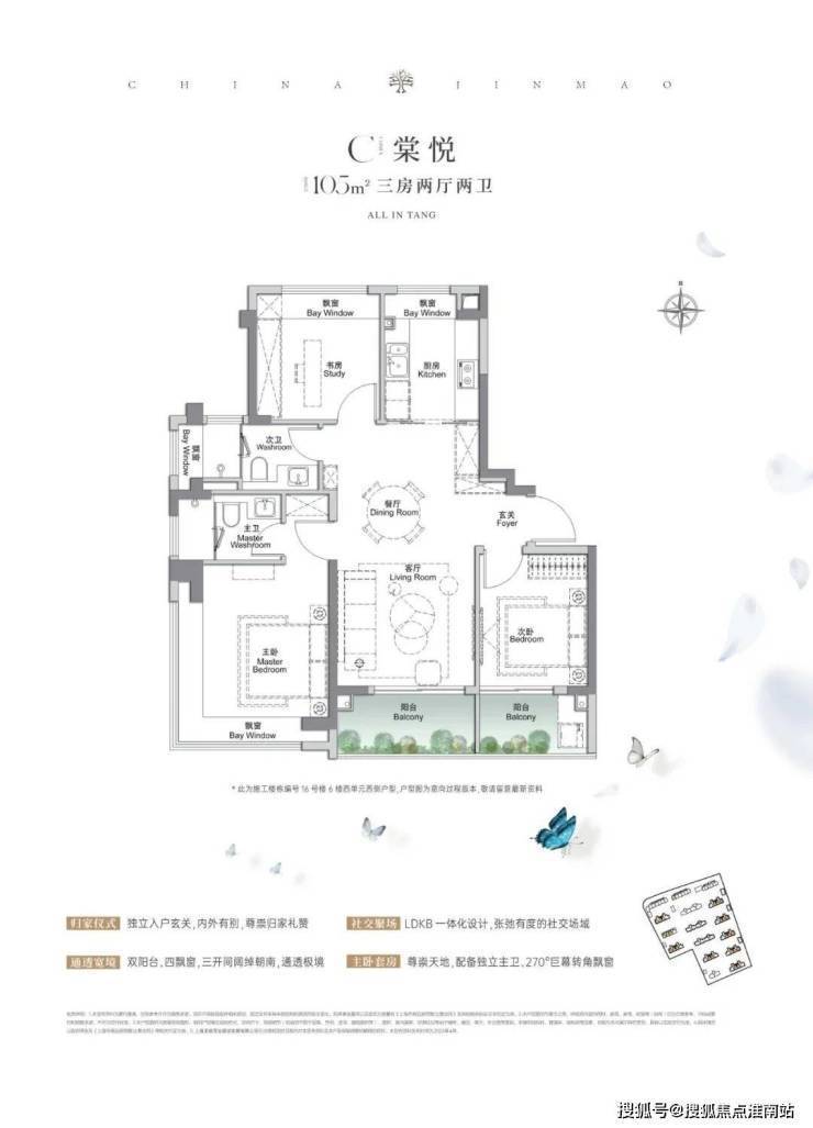 建面约105㎡3房2厅2卫,做到了三开间朝南+4个飘窗+双面阳台系统+主卧套房设计+270°转角飘窗,该户型的居住体验、舒适度、尺度感,是同级别产品所无法比拟的。