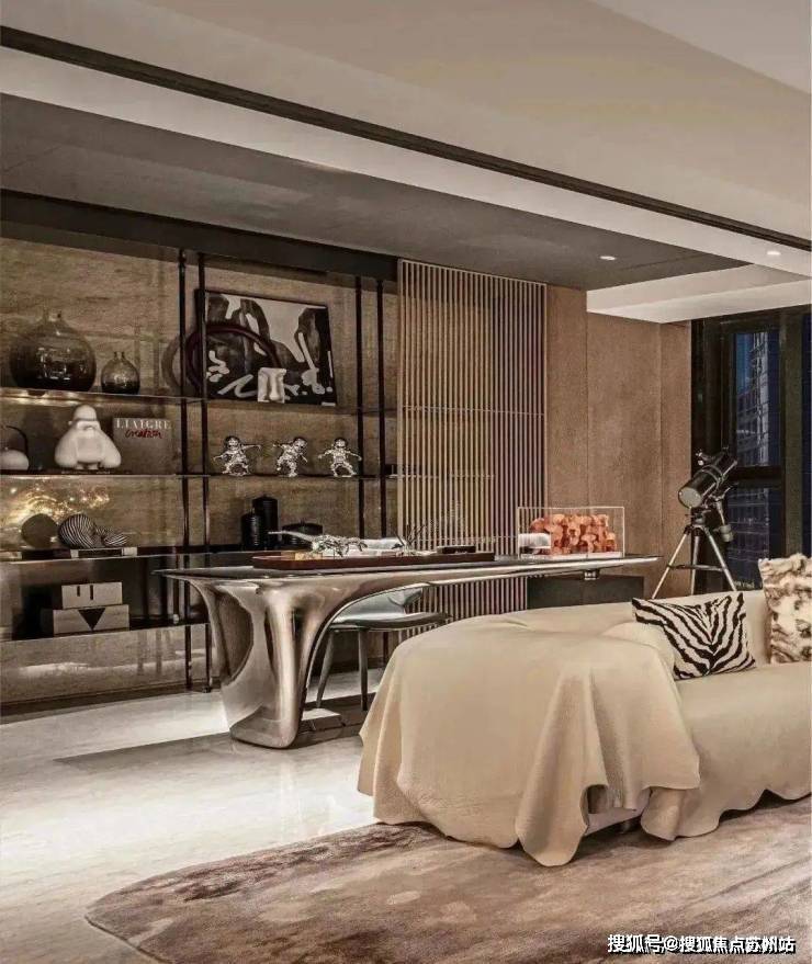 书房中的书桌设计,以柔美的曲线为主调,这种设计不仅符合人体工程学原理,减少了长时间使用电脑或书写时的疲劳感,同时也彰显了设计师对于细节的关注与追求.高品质的桌面材质与细腻的纹理处理,进一步提升了整个区域的质感与档次.