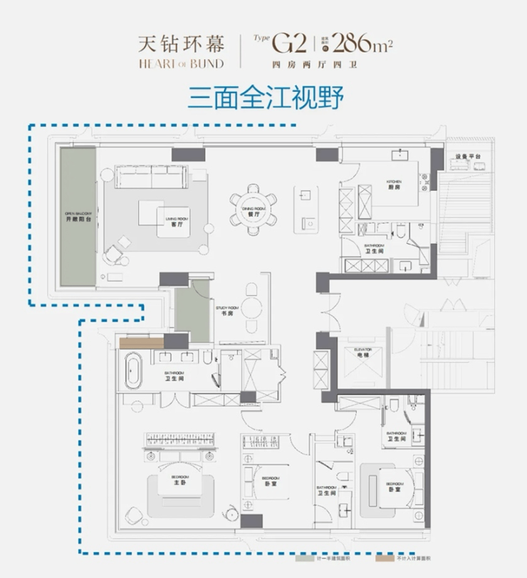 510㎡户型空间秉承“世界级一户一定制”理念,四个卧室均为全套房设计,主卧总统套可实现三面看江.