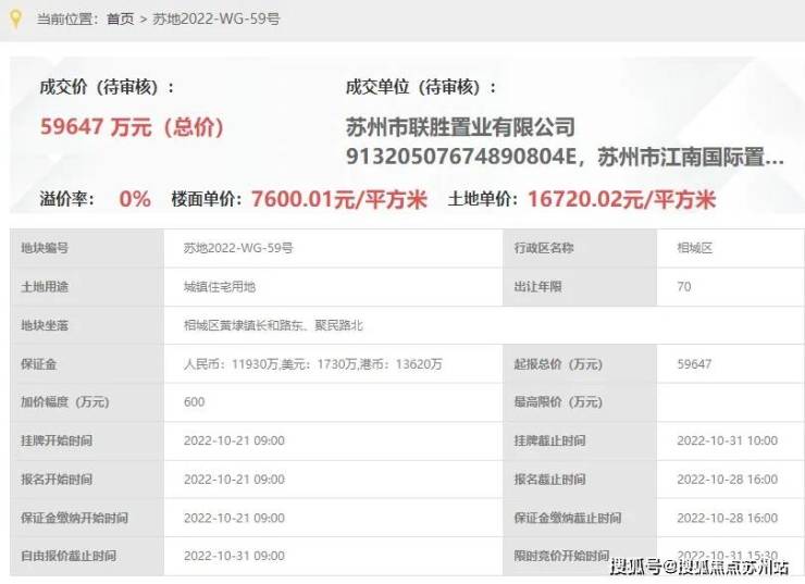 联胜&江南国际59号地块,即苏地2022-WG-59号,位于相城区黄埭镇长和路东侧、聚民路北侧,2022年10月由苏州市联胜置业有限公司&江南国际联合底价竞得!成交总价59647万元,成交楼面价7600元/㎡,溢价率0%。