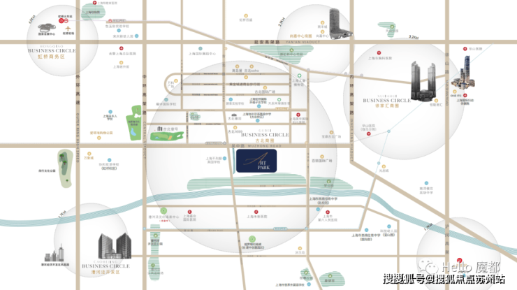 3公里左右可以快速到达爱琴海购物中心、万象城购物中心、徐家汇商圈的恒隆、ITC等。