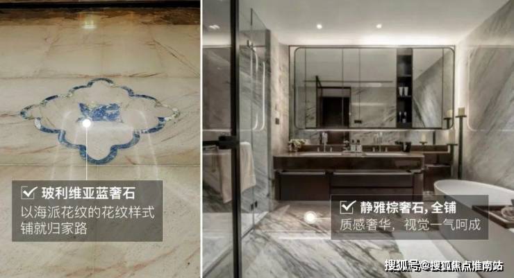 从私家电梯厅开始,地面局部点缀皇家蓝的玻利维亚蓝奢石,号称奢石中的爱马仕,并刻成海派花纹的样式,优雅又具仪式感.