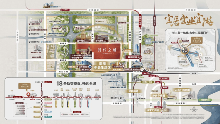 时代之城约30万方墅境国际生活大城,占位南翔中央生活区核心,以品质大城及互动街区为载体,以“一圈、两轴、三中心”为主题,匠心打造5分钟生活圈。