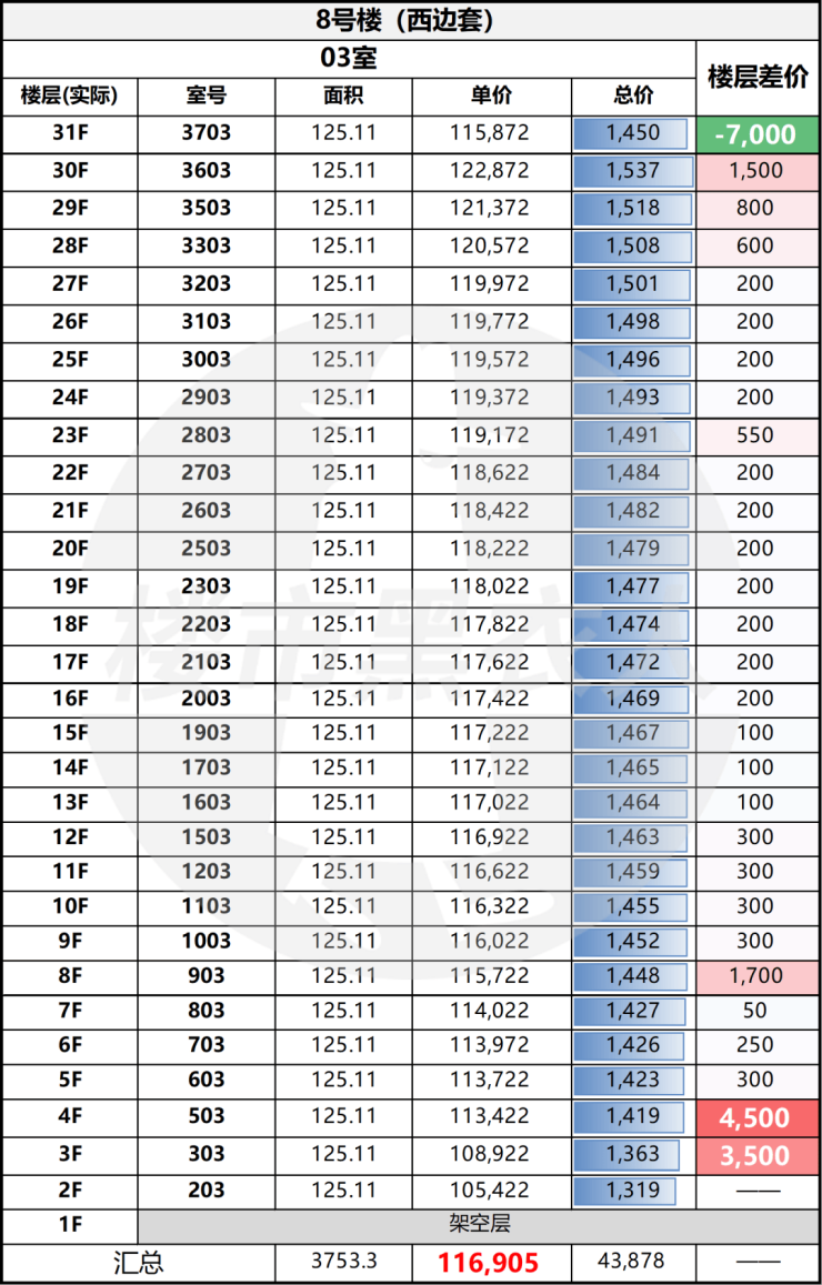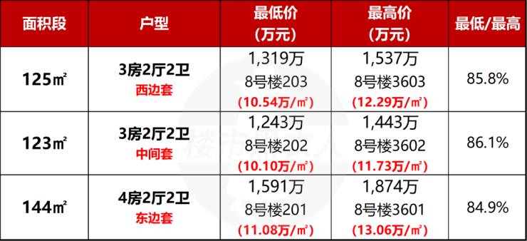 把8# 整栋的一房一价整体来看,你会发现它的定价并不是“均摊”而是很有方向感: