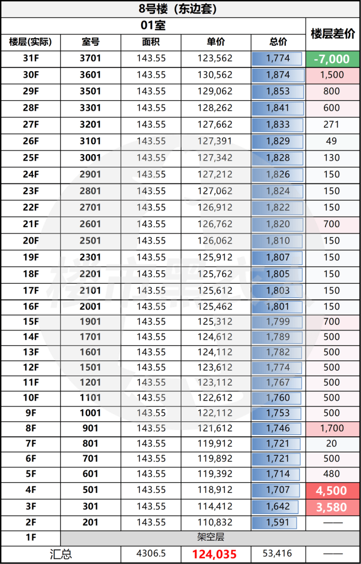 这一栋楼的楼层定价不算复杂,但对高区客户非常友好:体验跃迁很大,价格递增却相对克制,所以更适合“从高往下挑”。这句话你一定要反复强调,因为它能把很多人的“预算焦虑”直接按住——高区不是一定贵得离谱,相反很多时候是“贵得合理、值回票价”。