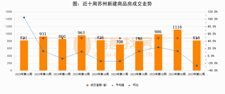 进入2023年第51周(12月11日-12月17日),苏州新建商品房成交818套,较上周减少298套,环比下降26.7%