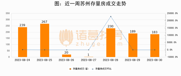 从存量房来看,2023年08月30日苏州存量房单日成交183套,比昨日减少6套,环比下降3.2%。从近一周存量房成交来看,苏州存量房日均成交套数为161套,08月30日单日成交183套,高于近一周平均水平13.7%。