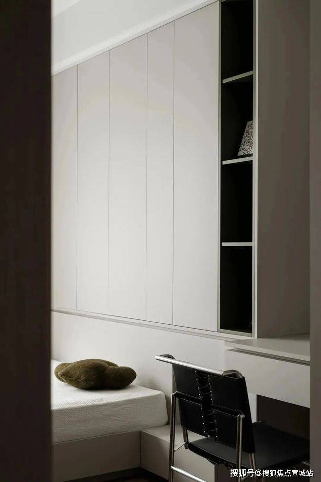 次卧则以功能为导向,通顶柜体与悬浮书桌优化了收纳效率,极简的书柜设计让空间回归干净利落的本质,满足高效生活的需求。